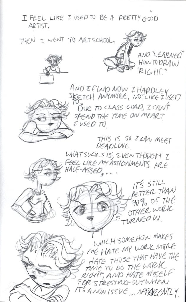 “Why I hate Art School,” was a series of comics I did while in school. I lost most of them when my laptop was stolen my senior year of college. I was not having a very good time in my life in general while in school as I had a lot that hit me all at once then.
